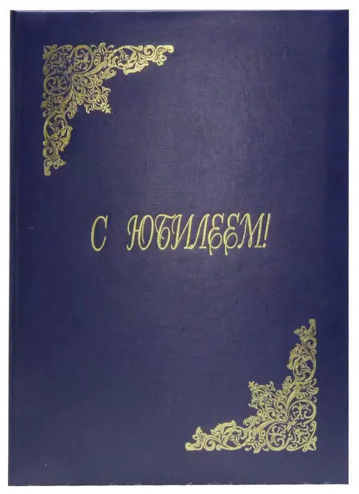 Адресная папка мягкая формата А4 изготовлена из бумвинила синего цвета. Внутренние вклейки — белая офсетная бумага. На обложку методом тиснения золотой фольгой нанесена надпись. Адресная папка подходит для поздравлений.
