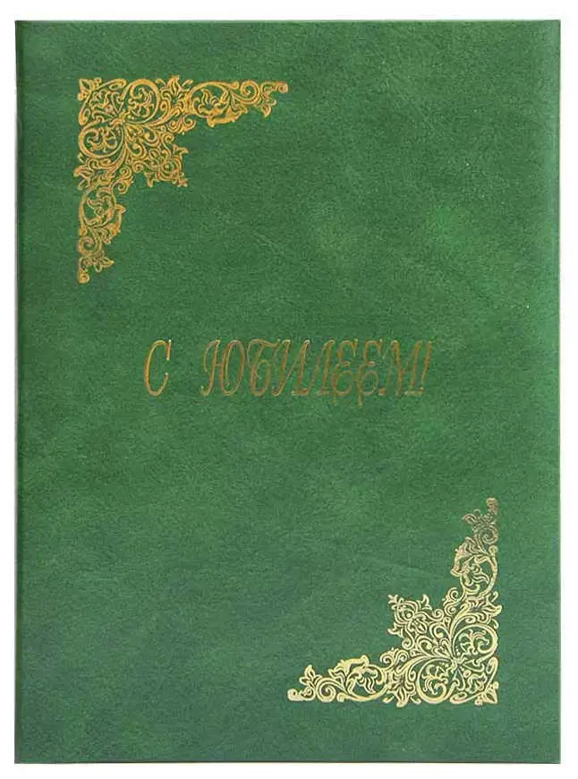 Адресная папка мягкая формата А4 изготовлена из бумвинила зеленого цвета, с разводами. Внутренние вклейки — белая офсетная бумага. На обложку методом тиснения золотой фольгой нанесена надпись. Адресная папка подходит для поздравлений.