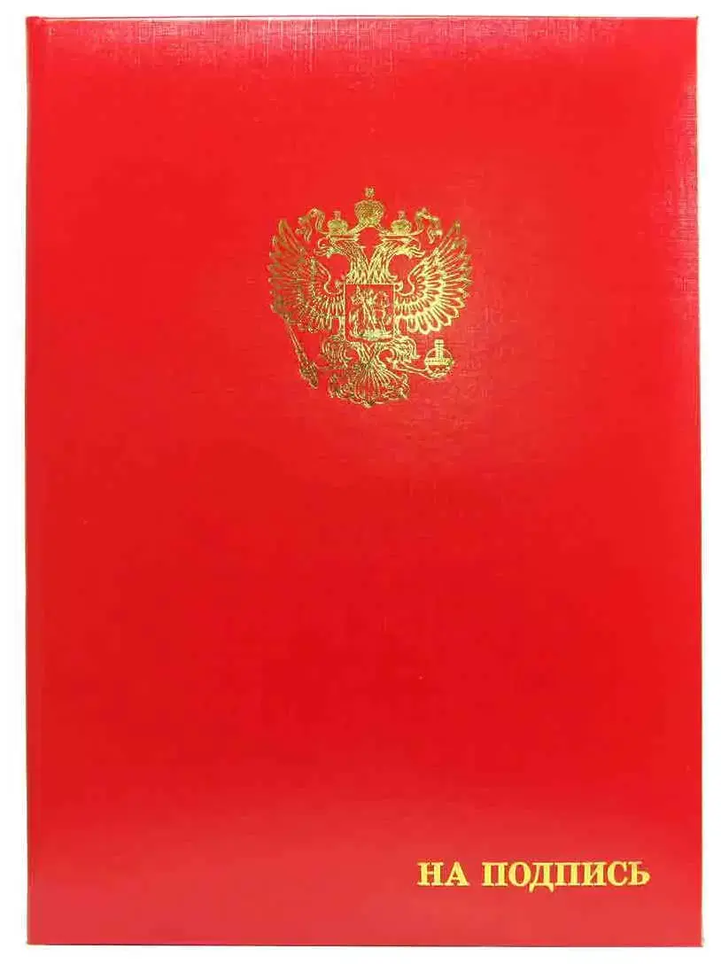 Папка адресная вертикальная формата А4 с внутренним корешком 20 мм, выполнена из красного бумвинила (пухлая). На лицевой стороне методом тиснения золотой фольгой нанесено изображение герба Российской федерации и надпись " НА ПОДПИСЬ".