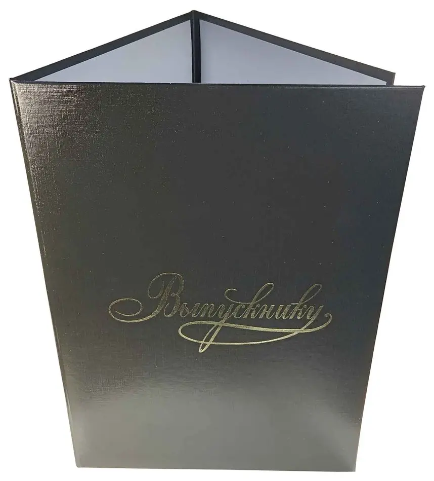 Адресная папка мягкая формата А4 изготовлена из бумвинила черного цвета. Внутренние вклейки — белая офсетная бумага. Трехсекционные. На обложку методом тиснения золотой фольгой нанесена надпись. Адресная папка подходит для поздравлений, хранения документов, а также подачи их на подпись.