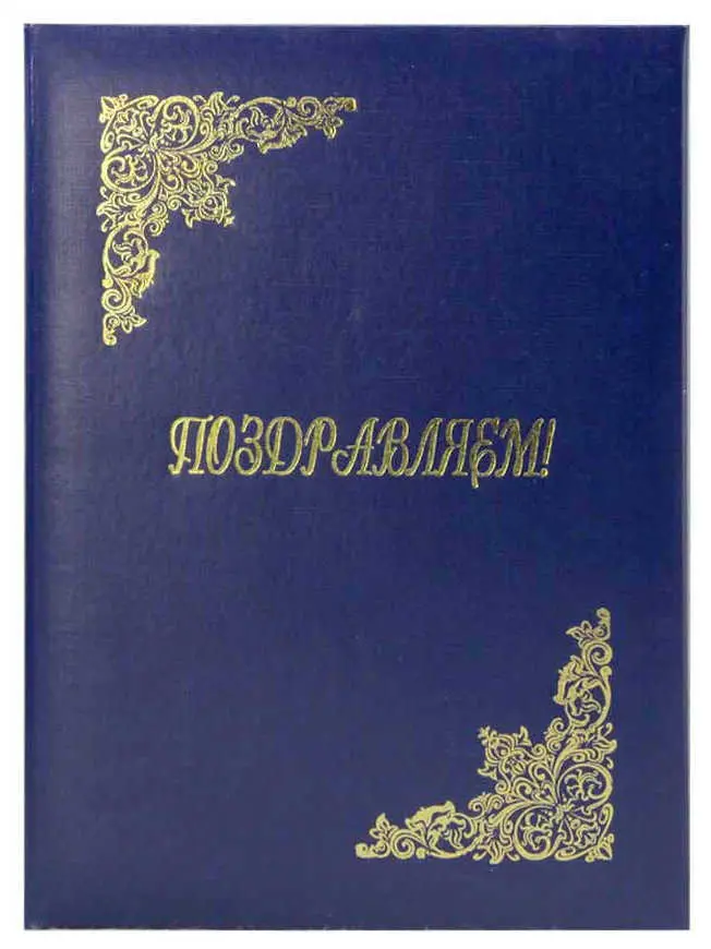 Адресная папка жесткая формата А4 изготовлена из бумвинила синего цвета. Внутренние вклейки — белая офсетная бумага. На обложку методом тиснения золотой фольгой нанесена надпись. Адресная папка подходит для поздравлений, хранения документов, а также подачиих на подпись.