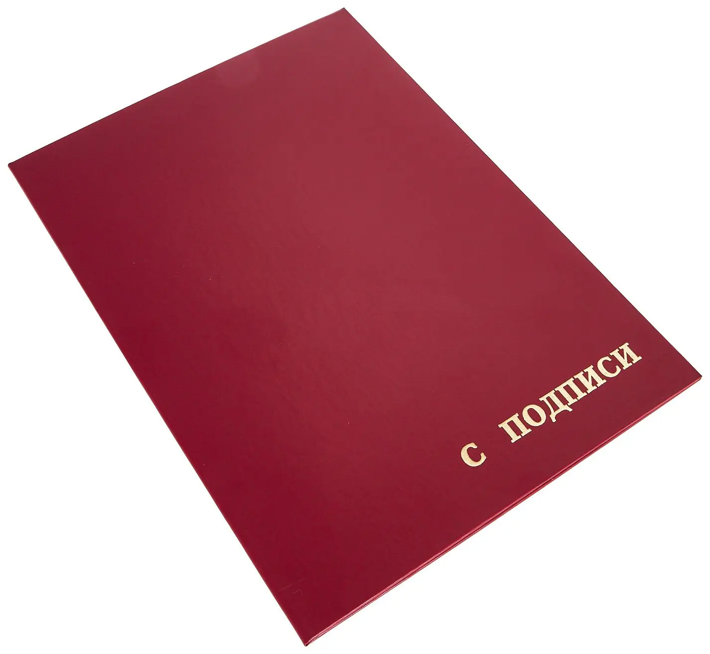 Адресная папка жесткая формата А4 изготовлена из бумвинила бордового цвета. Внутренние вклейки — белая офсетная бумага. На обложку методом тиснения золотой фольгой нанесена надпись. Адресная папка подходит для поздравлений, хранения документов, а также подачиих на подпись.