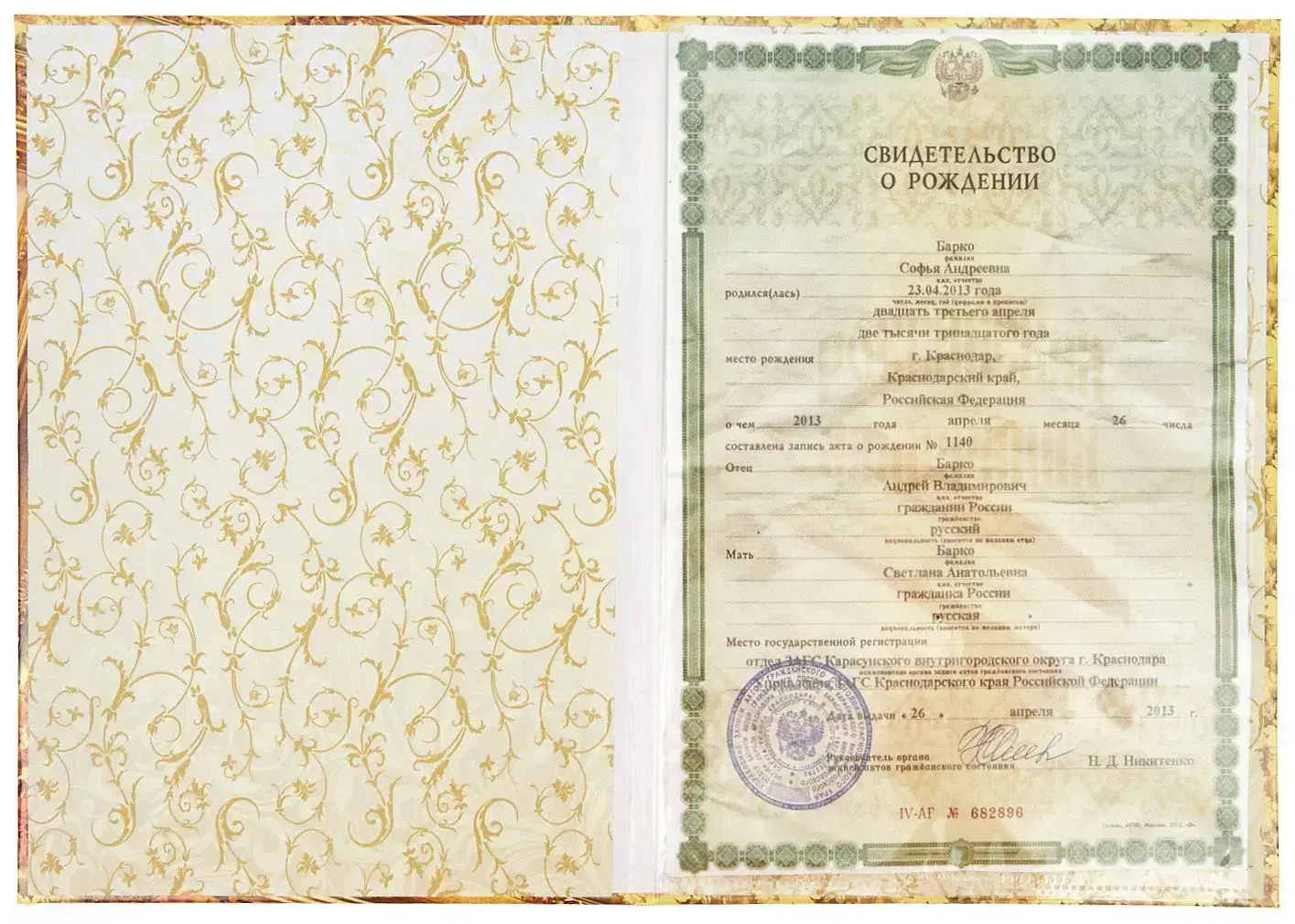 Папка с файлом ламинированная А4 (жесткая) "Свидетельство о рождении с виньеткой" Рамочка