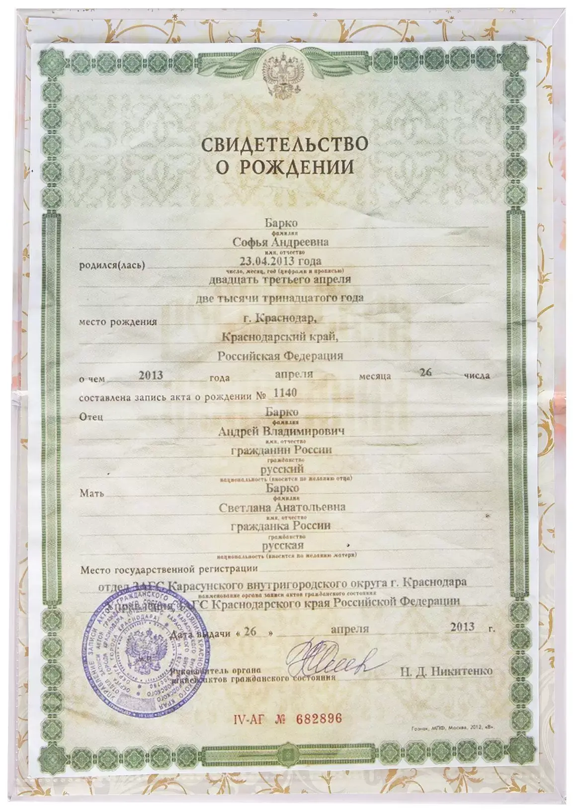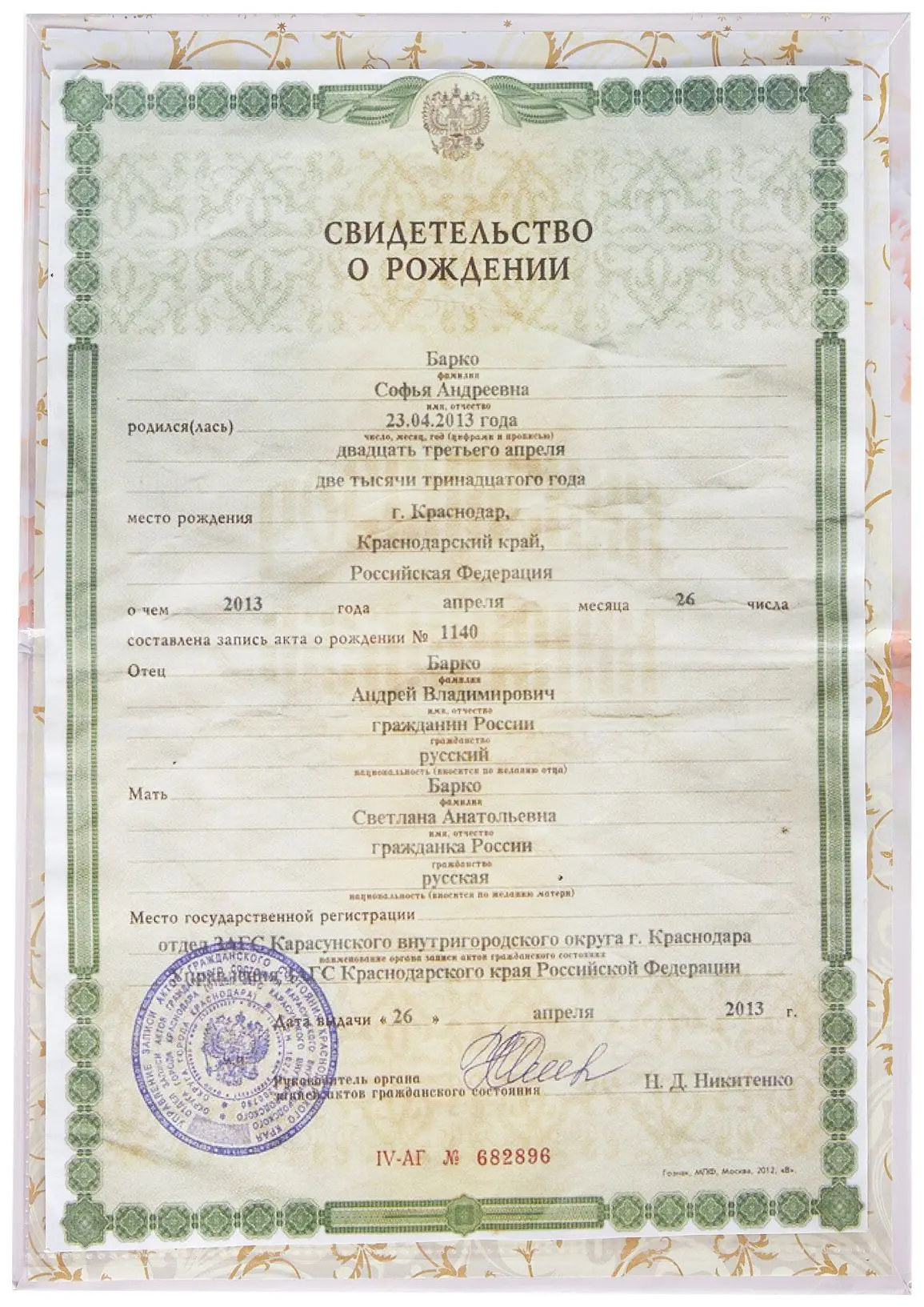 - Надпись (текст и рисунок): Свидетельство о рождении