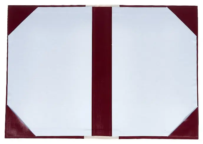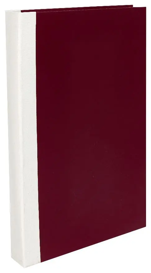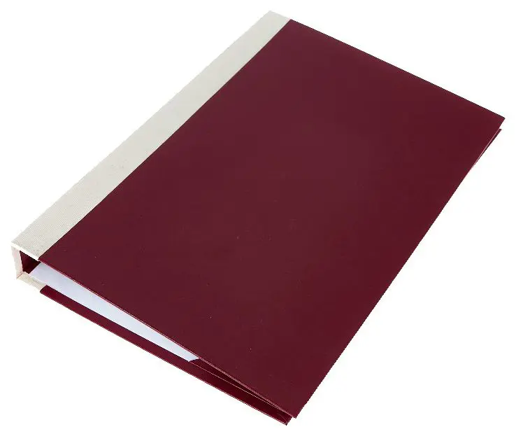 Папка жесткая, изготовлена из бордового бумвинила с мягким корешком 40 мм , выполненным из коленкора.