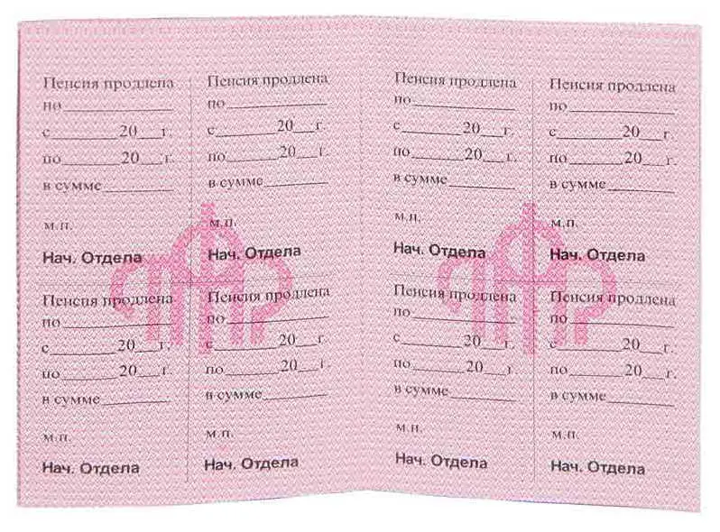 Пенсионное удостоверение в мягкой обложке 105*70 мм. Переплет изготовлен из бордового бумвинила. На первой половине лицевой стороны изображение Герба Российской Федерации,под ним надпись в две строки «ПЕНСИОННЫЙ ФОНД РОССИЙСКОЙ ФЕДЕРАЦИИ», ниже надпись в две строки большим шрифтом «ПЕНСИОННОЕ УДОСТОВЕРЕНИЕ», выполненные золотым тиснением. На второй половине лицевой стороны надписей нет. Внутри блок из 4-х листов и вклейка 2-х страниц на обложке для заполнения. На каждой странице нанесена защитная тангирная сетка светло-розового цвета. В центре каждой страницы - эмблема ПФР более темного розового цвета.