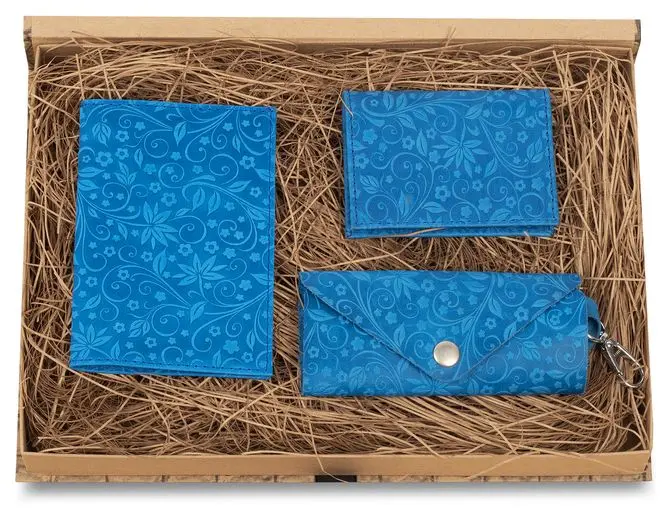 Подарочный набор "Классик" из натуральной кожи, голубой, тиснение "Флаверс"