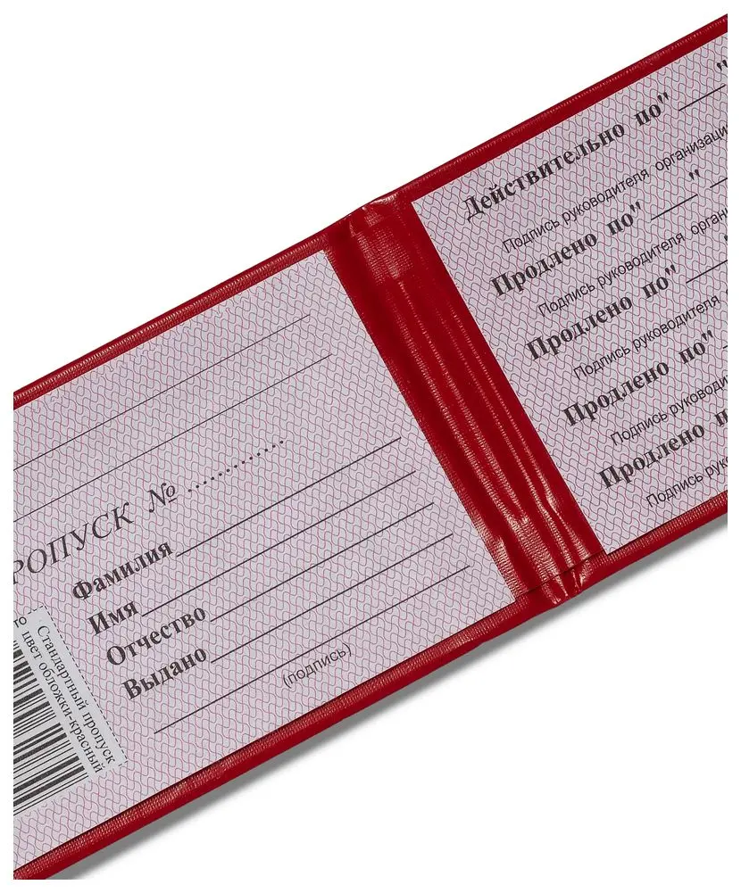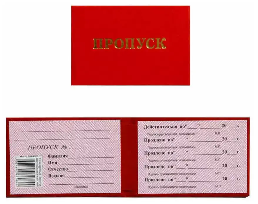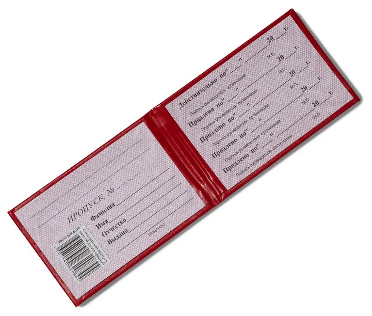Пропуск в жесткой обложке 95*65 мм. Переплет изготовлен из красного бумвинила, надпись "ПРОПУСК" выполнена золотым тиснением. Внутри бланк имеет бумажную вклейку для заполнения и место для фотографии .