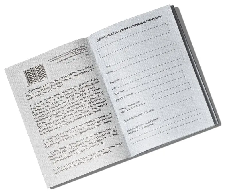 - Наименование изделия: Сертификат профилактических прививок