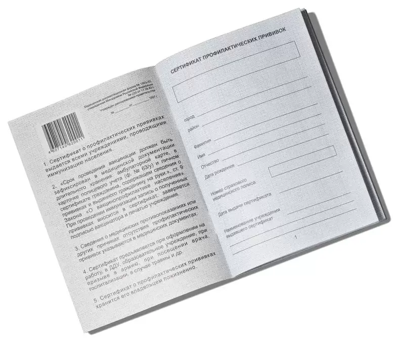 Сертификат профилактических прививок, обложка из синего бумвинила. На лицевой стороне надпись " Сертификат профилактических прививок", выполнена золотым тиснением. Внутри блок для записей о прохождении прививок.