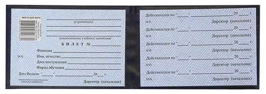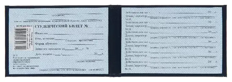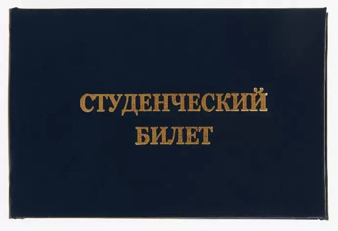 Студенческий билет в жесткой обложке 95*65 мм. Переплет изготовлен из синего бумвинила, надпись "СТУДЕНЧЕСКИЙ БИЛЕТ" выполнена золотым тиснением. Внутри бланк имеет бумажную вклейку для заполнения и место для фотографии.