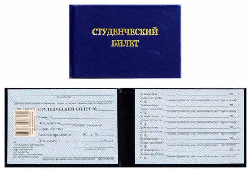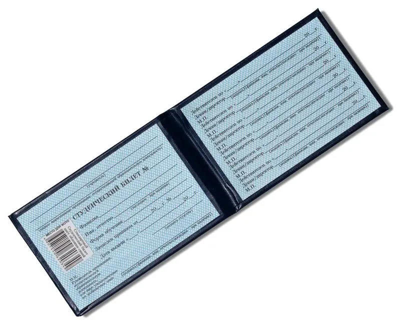 Студенческий билет в жесткой обложке 95*65 мм. Переплет изготовлен из синего бумвинила, надпись "СТУДЕНЧЕСКИЙ БИЛЕТ" выполнена золотым тиснением. Внутри бланк имеет бумажную вклейку для заполнения и место для фотографии.