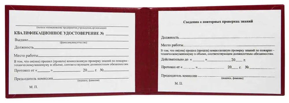 Удостоверение в жесткой обложке 95*65 мм. Переплет изготовлен из бодового бумвинила. На лицевой стороне надпись "Удостоверение о проверке знаний требований пожарно-технического минимума", выполнена золотым тиснением. Внутри бумажная вклейка для заполнения.