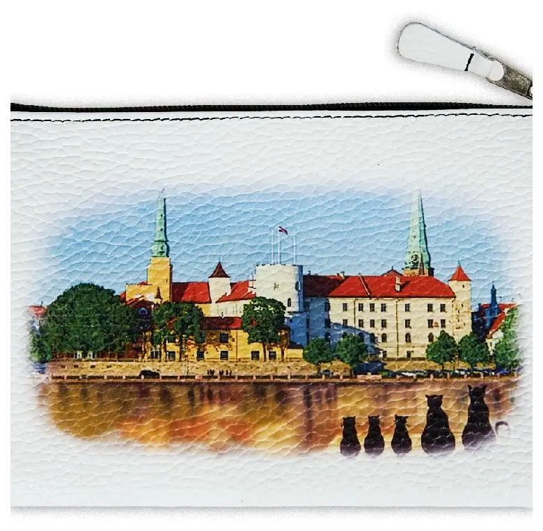 Косметичка из натуральной кожи 21x0,5x12,5 см, цветной рисунок по коже "Пять котов"