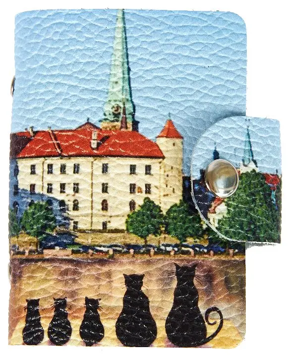 Визитница вертикальная 1 секц. (18 карманов) из натуральной кожи, на кнопке, цветной рисунок по коже "Пять котов"