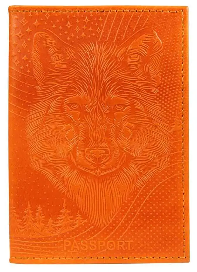 Обложка для паспорта из натуральной кожи, рыжий, сплошное тиснение по коже "Волк"