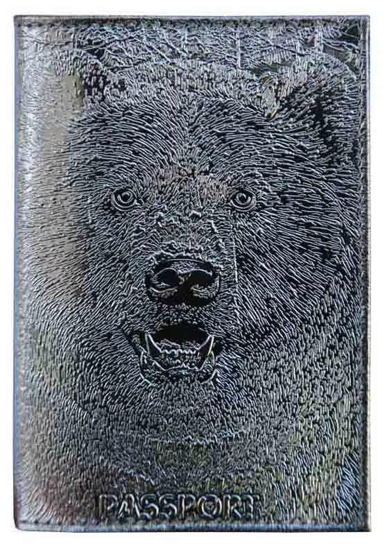 Обложка для паспорта из натуральной кожи, серебряный, сплошное тиснение фольгой "металлик" по коже "Медведь 3D"