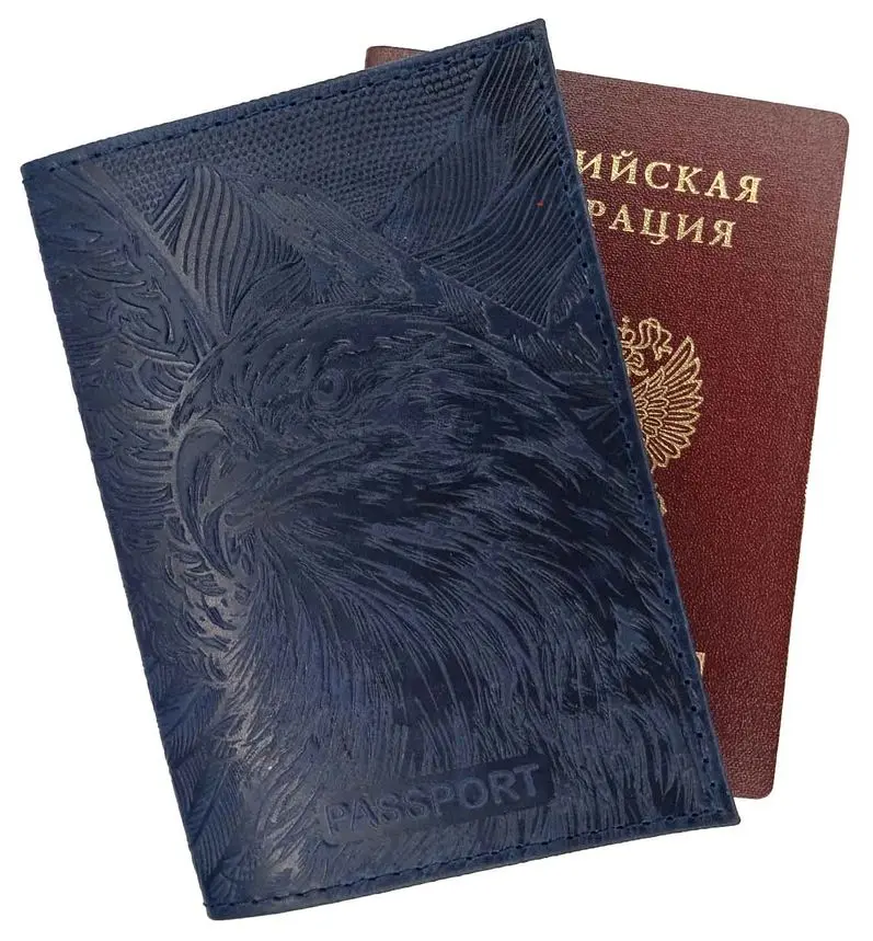 Обложка для паспорта из натуральной кожи, синий, сплошное тиснение по коже "Орел"