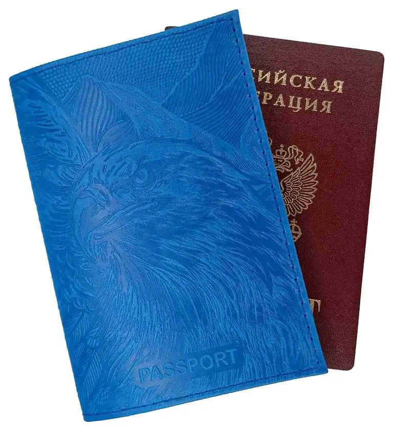 Обложка для паспорта из натуральной кожи, голубой, сплошное тиснение по коже "Орел"