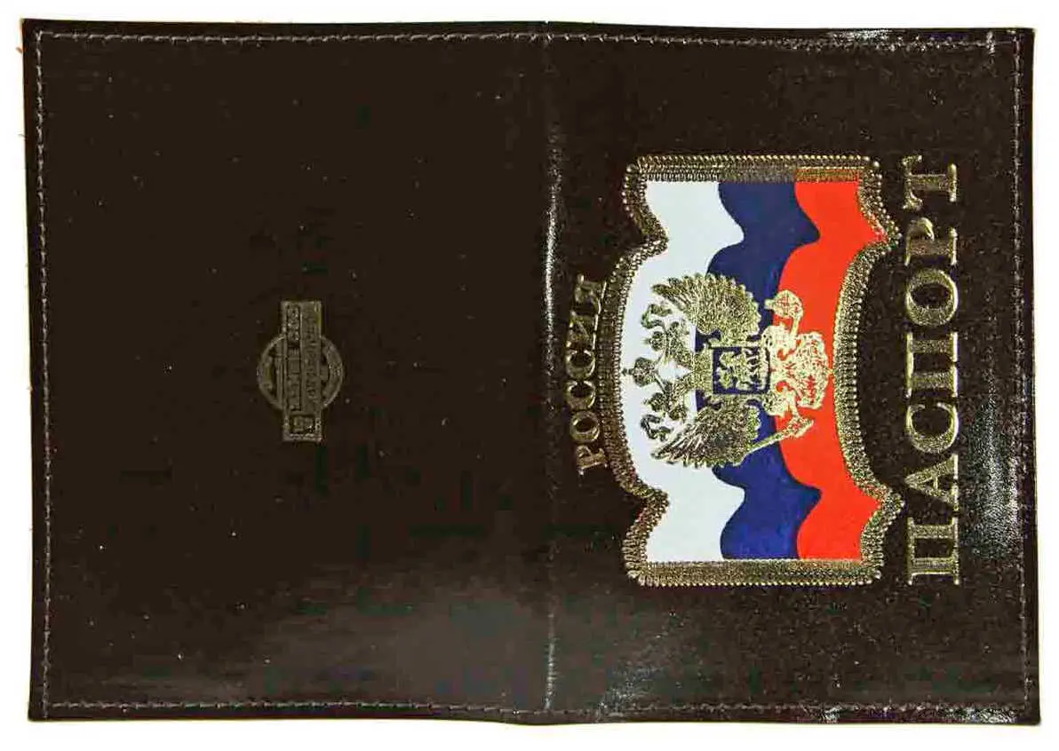 Обложка для паспорта из лакированной натуральной кожи, черный, тисн.комбинированное 3-х цветное"ПАСПОРТ-ГЕРБ-ФЛАГ"