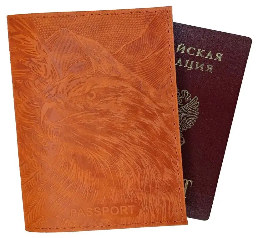 Обложка для паспорта из натуральной кожи, рыжий, сплошное тиснение по коже "Орел"