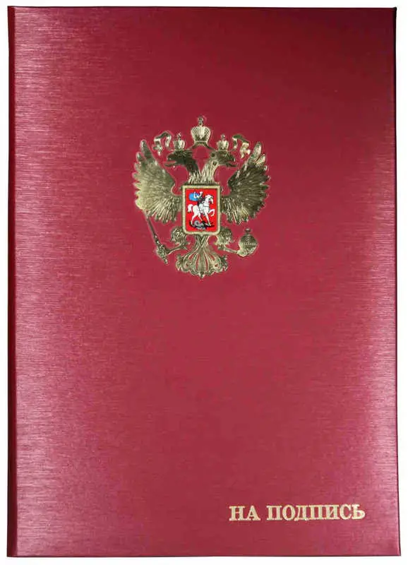 Папка адресная дизайнерские материалы с Рос.орлом в виде метал.пластины А4 (пухлая) "На подпись" шелк красный