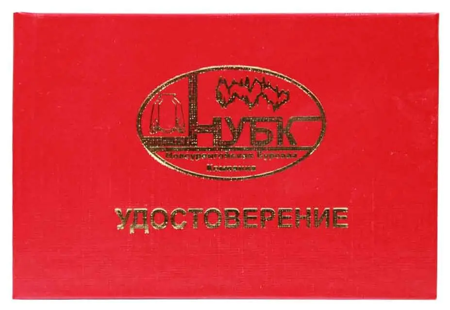 Удостоверение жесткое, 95*65 мм, бумвинил красный, тиснение золото "НУБК", без вклейки