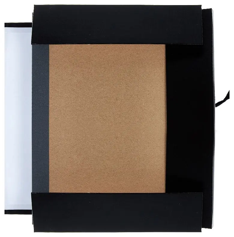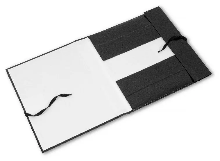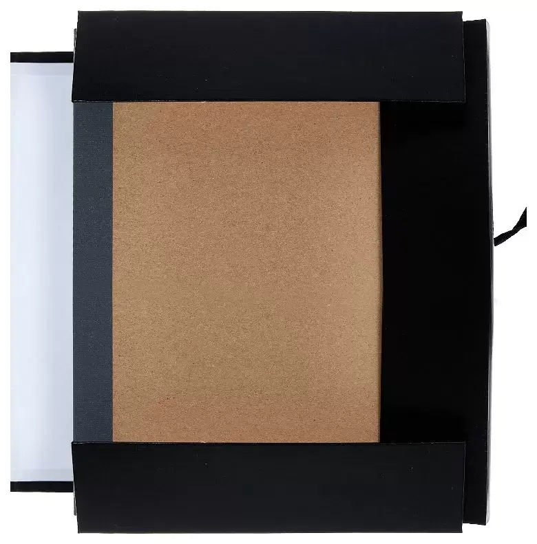 Архивная папка жесткая. Выполнена из плотного переплетного картона, обклеенного бумвинилом черного цвета, с корешками 50 мм и тремя клапанами. Сторонки папки выклеены белой бумагой. Папка вмещает до 500 листов формата А4. Папка завязывается на 2 шнурка.