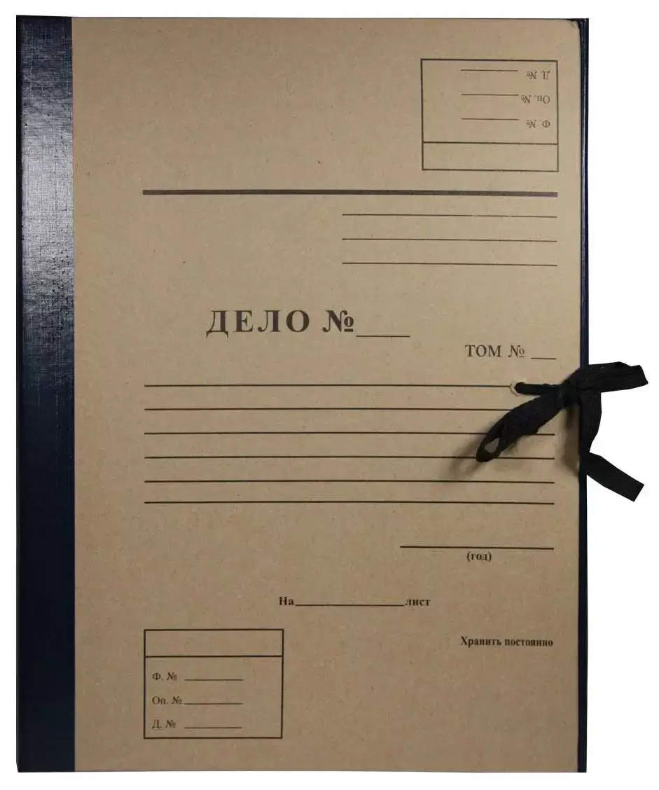 Архивная папка формата А4. Изготовлена из плотного переплетного картона, с внешней стороны покрыт бумвинилом синего цвета. Внутри папка обклеена крафт-бумагой плотностью 80гр/м2, также имеются мягкие клапана. В закрытом виде фиксируется с помощью 4 завязок. Папка вмещает 500 листов. Позволяет хранить документы как в вертикальном, так и в горизонтальном положении. Размер изделия в собранном виде - 230х310х50 мм. Размер изделия в сложенном виде - 280х310 мм. Поставка производится в сложенном виде. Упаковка в гофрокороб по 25шт. Вес упаковки 5,72 кг. Размер упаковки: 300х320х180 мм.
