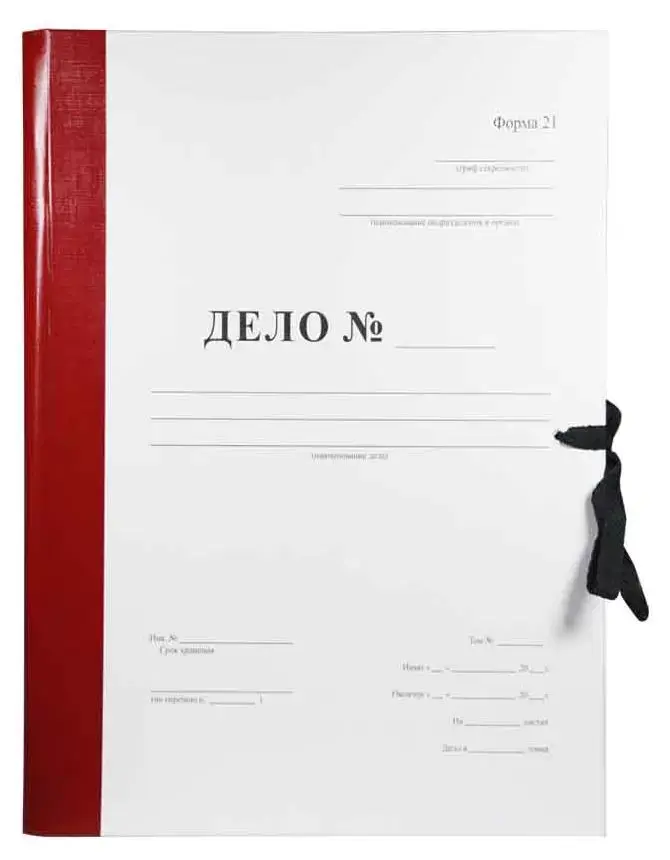 Архивная папка «ДЕЛО №…» (форма 21) формата А4 выполнена из плотного картона, обклеенного офсетной бумагой. Корешок мягкий, шириной 100 мм, выполнен из красного бумвинила. Внутренние гребешки с 4 отверстиями из плотного картона и бумвинила того же цвета позволяют подшивать документы с помощью шнура до 950 листов. В закрытом виде папка фиксируется двумя завязками.