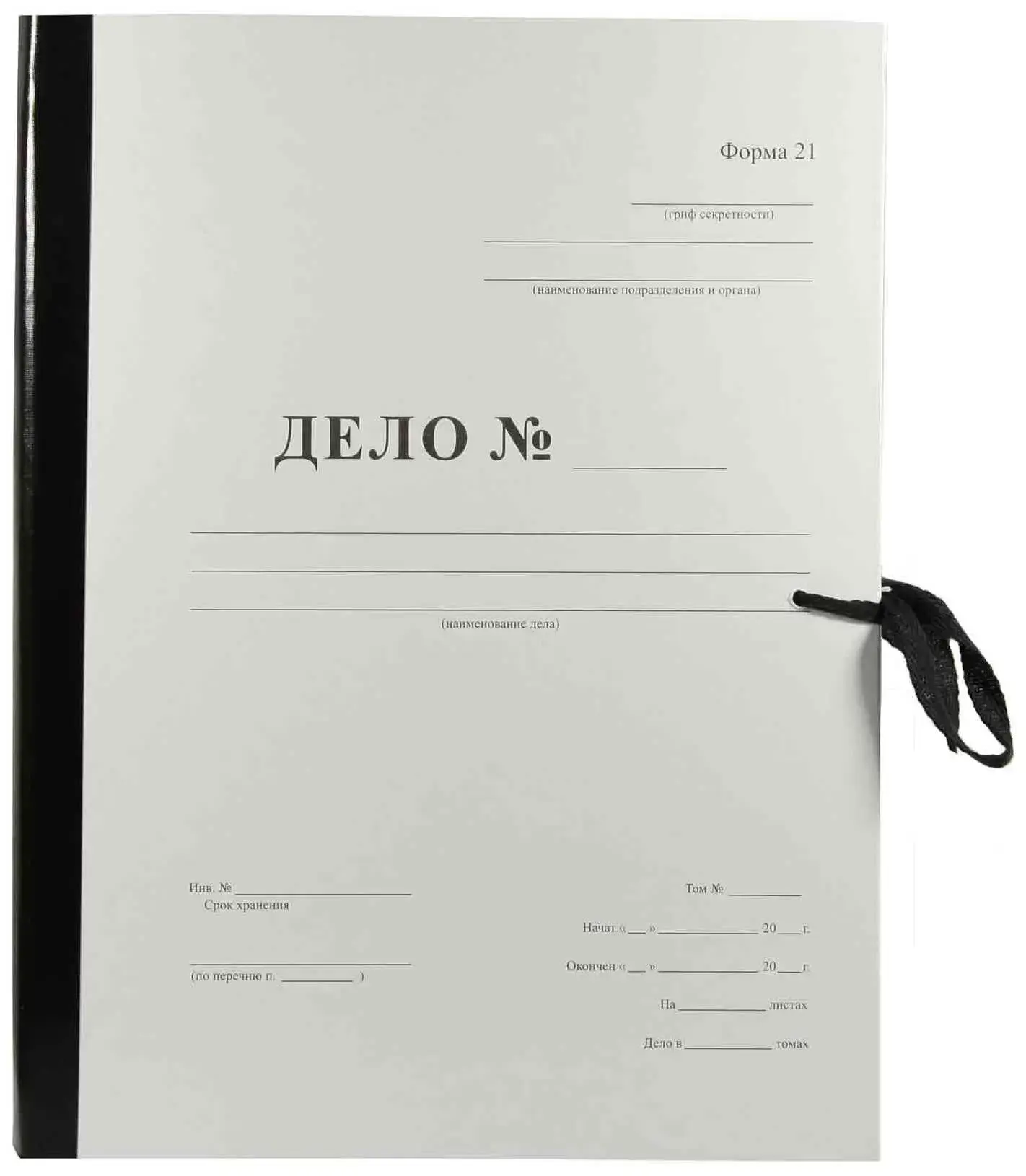 Архивная папка «ДЕЛО №…» (форма 21) формата А4 выполнена из плотного картона, обклеенного офсетной бумагой. Корешок мягкий, шириной 20 мм, выполнен из черного бумвинила. Внутренние гребешки с 4 отверстиями из плотного картона и бумвинила того же цвета позволяют подшивать документы с помощью шнура до 150 листов. В закрытом виде папка фиксируется двумя завязками.