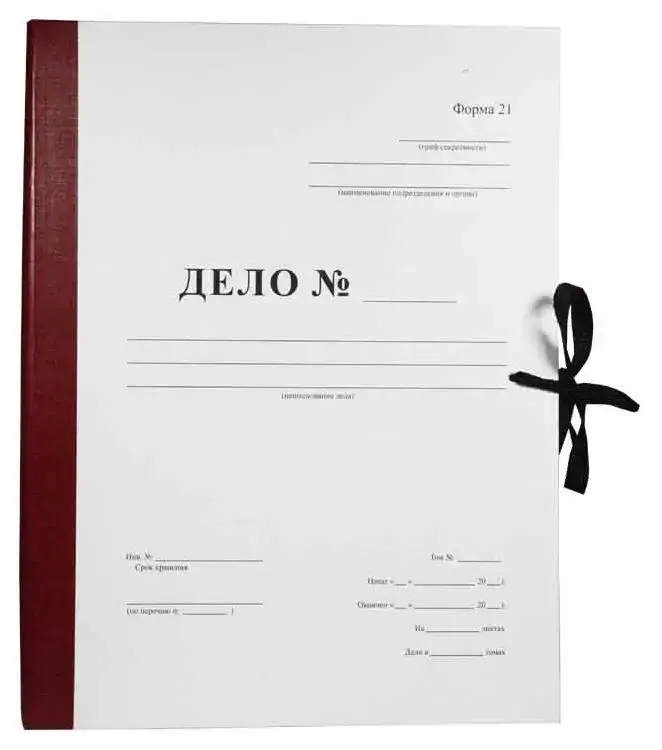 Архивная папка «ДЕЛО №…» (форма 21) формата А4 выполнена из плотного картона, обклеенного офсетной бумагой. Корешок мягкий, шириной 50 мм, выполнен из бордового бумвинила. Внутренние гребешки с 4 отверстиями из плотного картона и бумвинила того же цвета позволяют подшивать документы с помощью шнура до 450 листов. В закрытом виде папка фиксируется двумя завязками.
