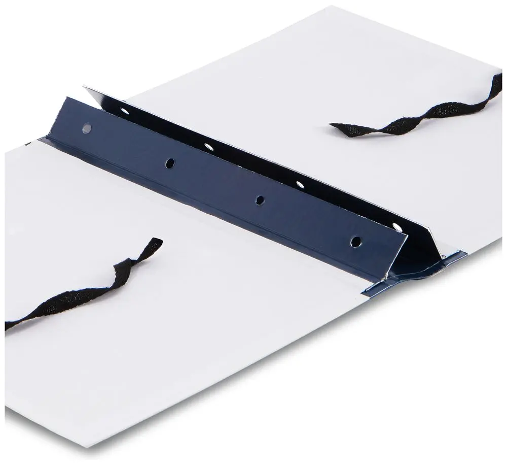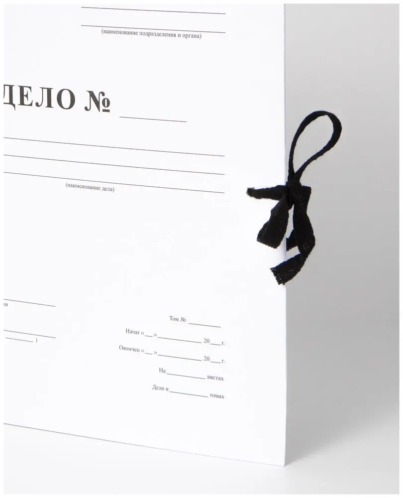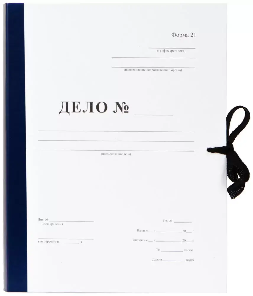 Архивная папка «ДЕЛО №…» (форма 21) формата А4 выполнена из плотного картона, обклеенного офсетной бумагой. Корешок мягкий, шириной 50 мм, выполнен из синего бумвинила. Внутренние гребешки с 4 отверстиями из плотного картона и бумвинила того же цвета позволяют подшивать документы с помощью шнура до 450 листов. В закрытом виде папка фиксируется двумя завязками.