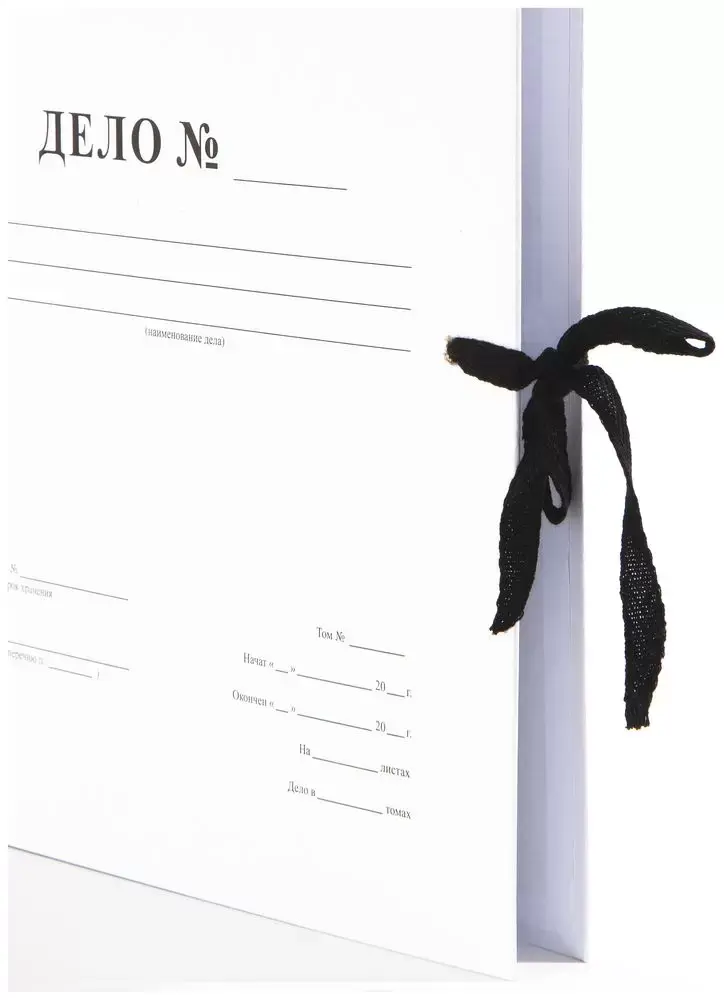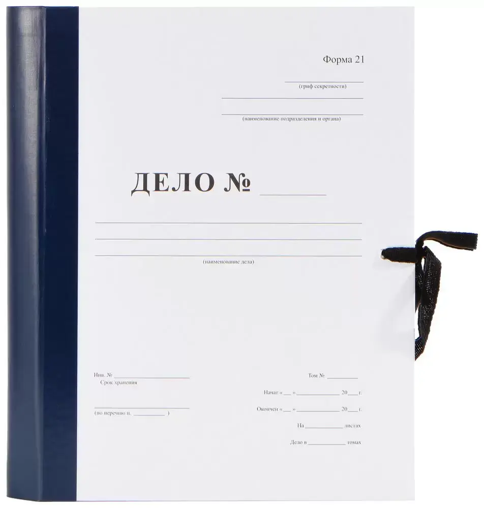 Архивная папка «ДЕЛО №…» (форма 21) формата А4 выполнена из плотного картона, обклеенного офсетной бумагой. Корешок мягкий, шириной 70 мм, выполнен из синего бумвинила. Внутренние гребешки с 4 отверстиями из плотного картона и бумвинила того же цвета позволяют подшивать документы с помощью шнура до 650 листов. В закрытом виде папка фиксируется двумя завязками.