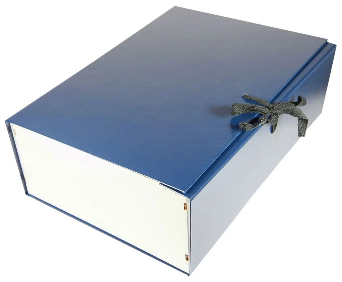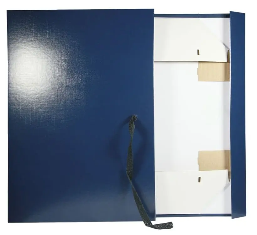 Архивный короб формат А4. Изготовлен из плотного переплетного картона, с внешней стороны покрыт бумвинилом синего цвета. С внутренней стороны белая бумага, имеются стойки-упоры разборные из гофрокартона. В закрытом виде фиксируется с помощью двух завязок. Короб вмещает до 1000 листов формата А4. Размер изделия в собранном виде - 225х105х320 мм. Упаковка в гофрокороб по 25 шт. Вес упаковки 8 кг. Размер упаковки 475х345х205 мм. Поставляются в разобранном виде.