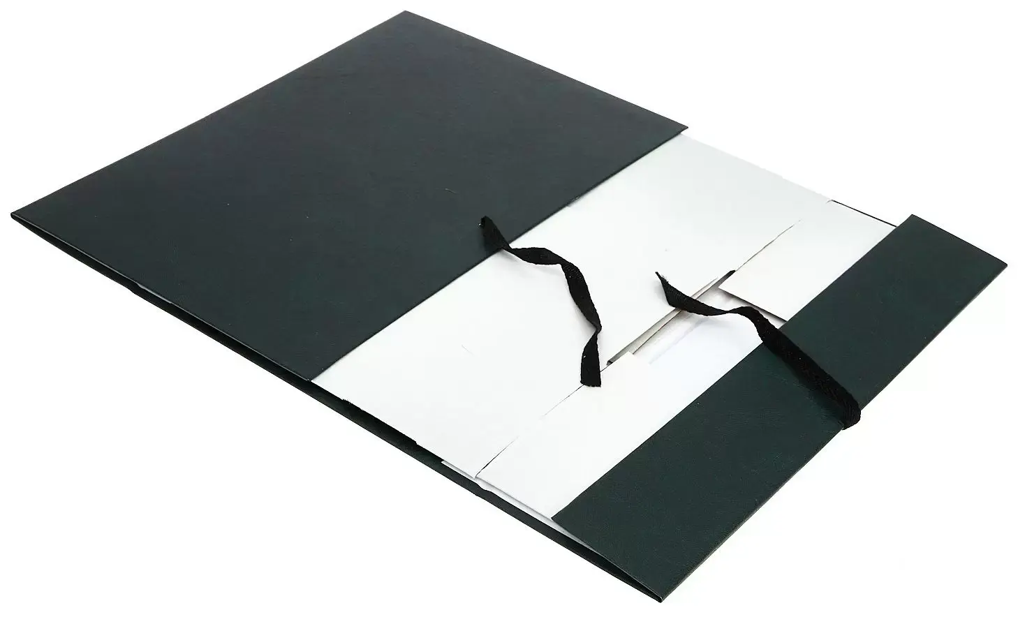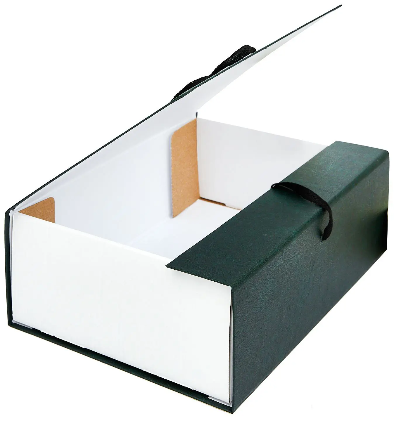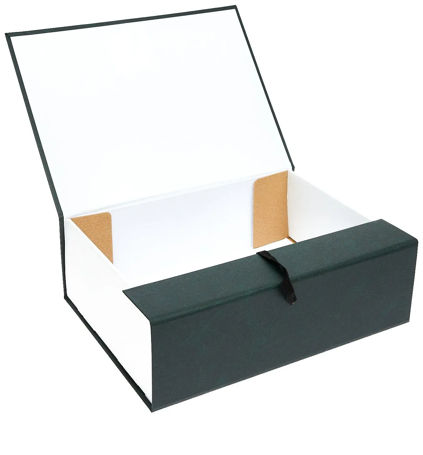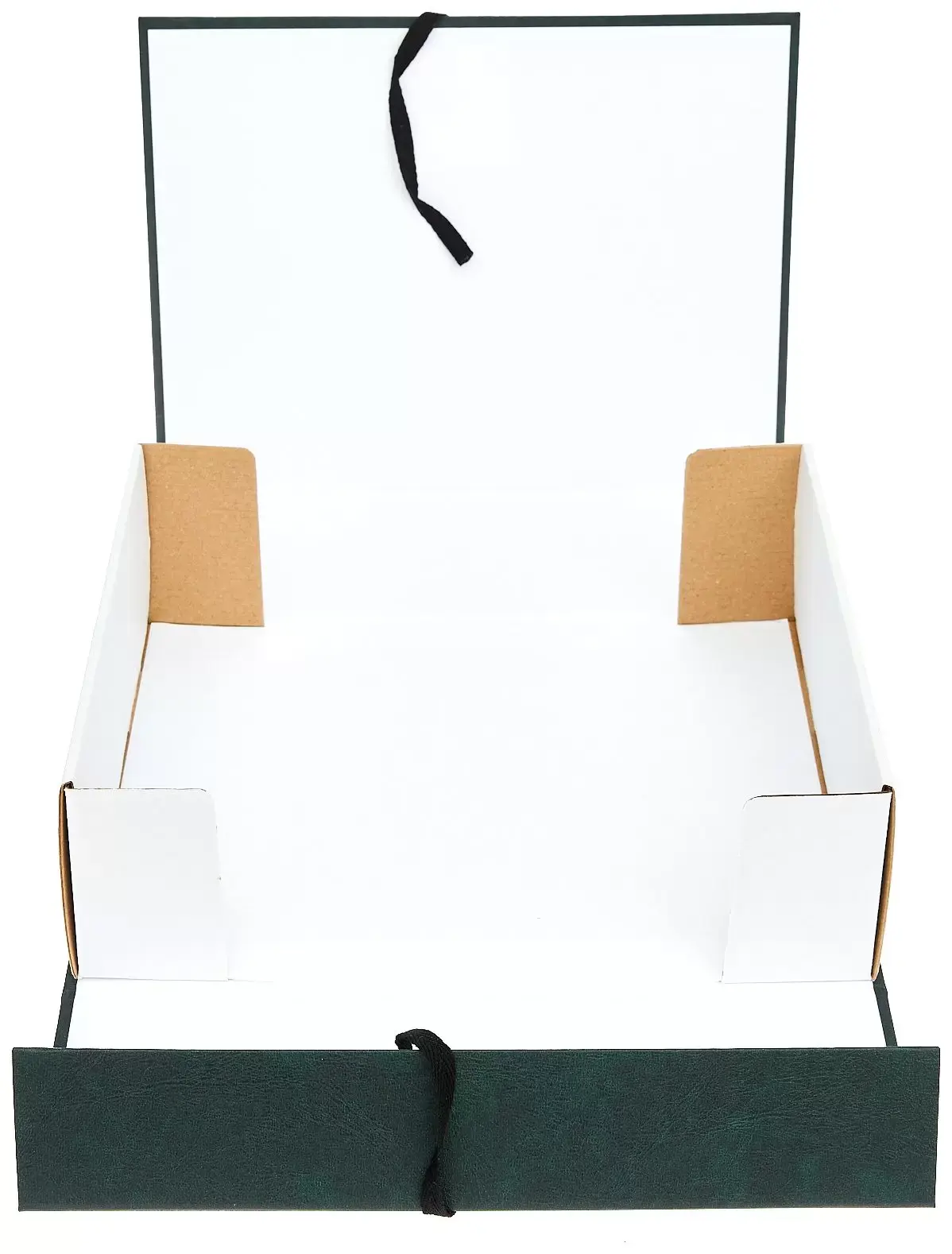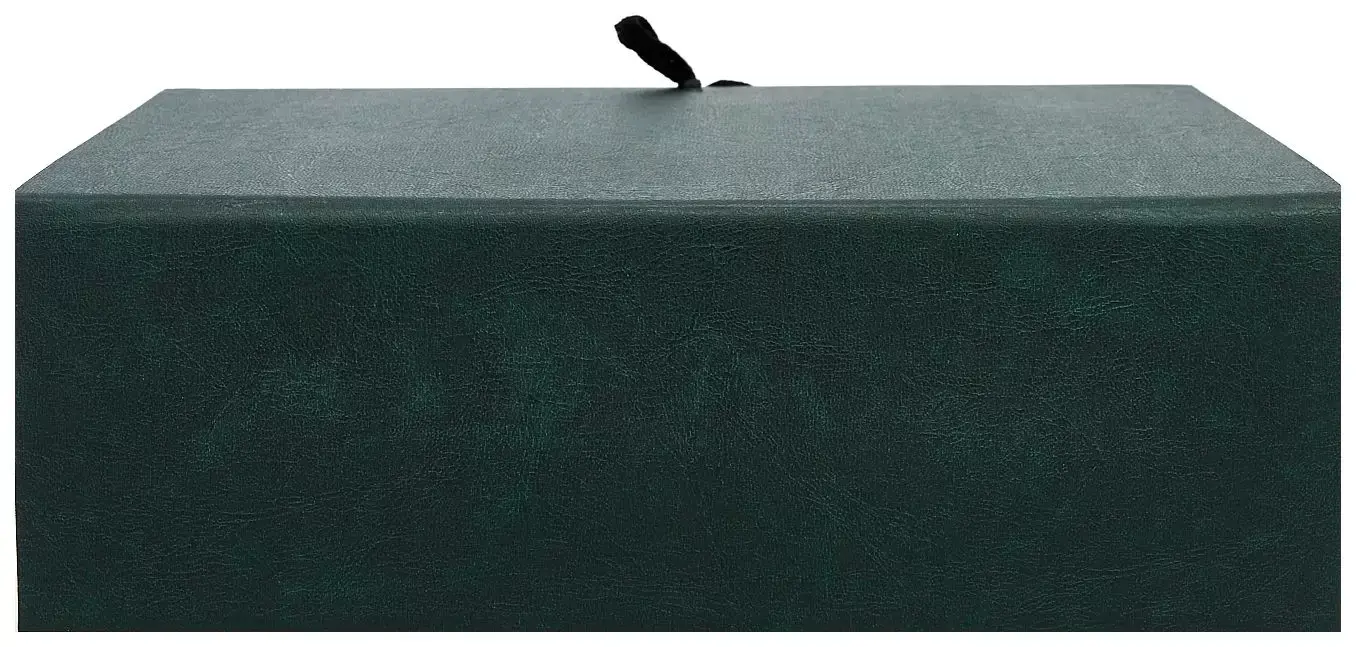 покрыт бумвинилом темно-зеленого цвета. Внутри короб обклеен офсетной бумагой, также имеются стойки-упоры, выполненные из гофрокартона. В закрытом виде фиксируется