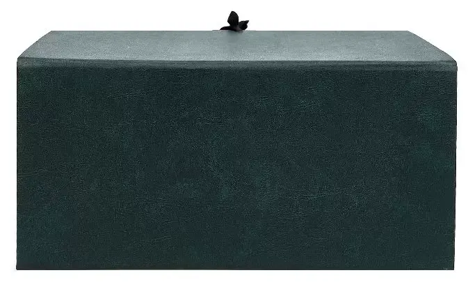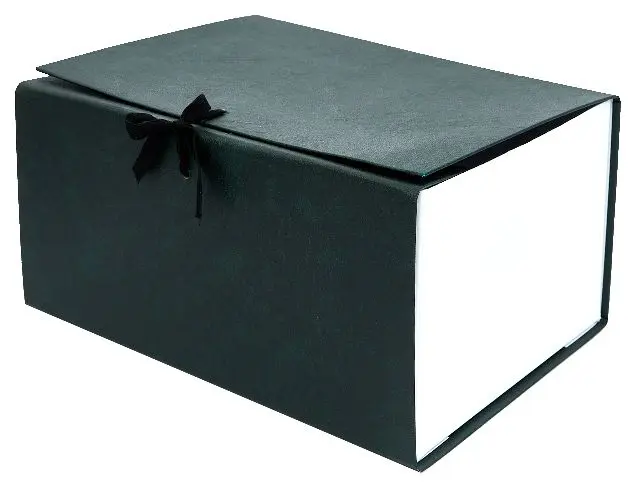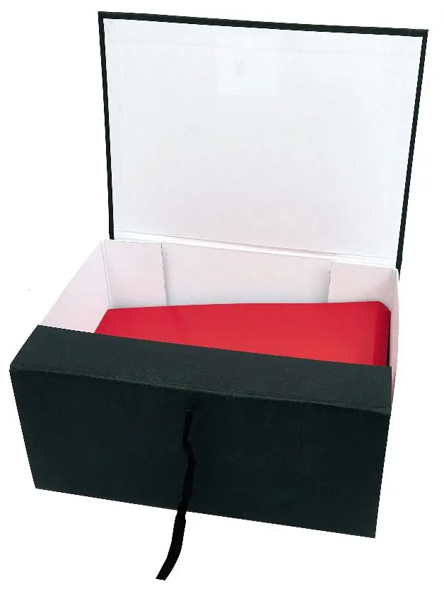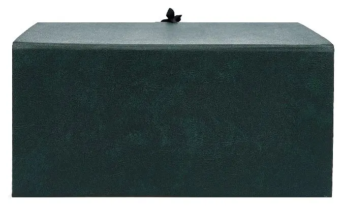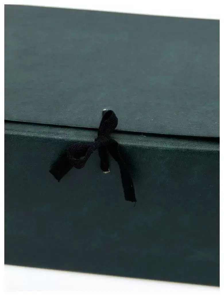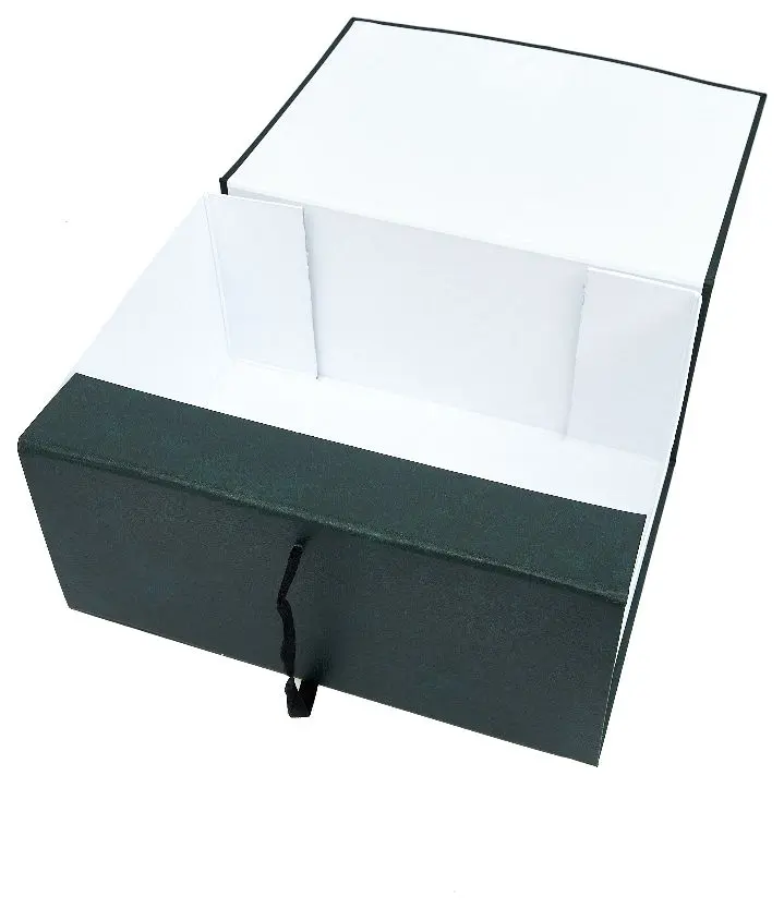 Архивный короб формата А4. Изготовлен из плотного переплетного картона, с внешней стороны покрыт бумвинилом темно-зеленого цвета. Внутри короб обклеен офсетной бумагой, также имеются стойки-упоры, выполненные из плотного картона. В закрытом виде фиксируется с помощью двух хлопчатобумажных завязок.