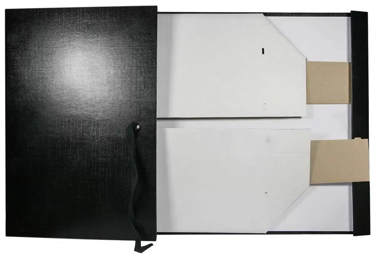 Архивный короб формат А4. Изготовлен из плотного переплетного картона, с внешней стороны покрыт бумвинилом черного цвета. С внутренней стороны белая бумага, имеются стойки-упоры разборные из гофрокартона. В закрытом виде фиксируется с помощью двух завязок. Короб вмещает до 1500 листов формата А4. Размер изделия в собранном виде - 225х155х320 мм. Упаковка в гофрокороб по 25 шт. Вес упаковки 9,7 кг. Размер упаковки 580х345х205 мм. Поставляются в разобранном виде.