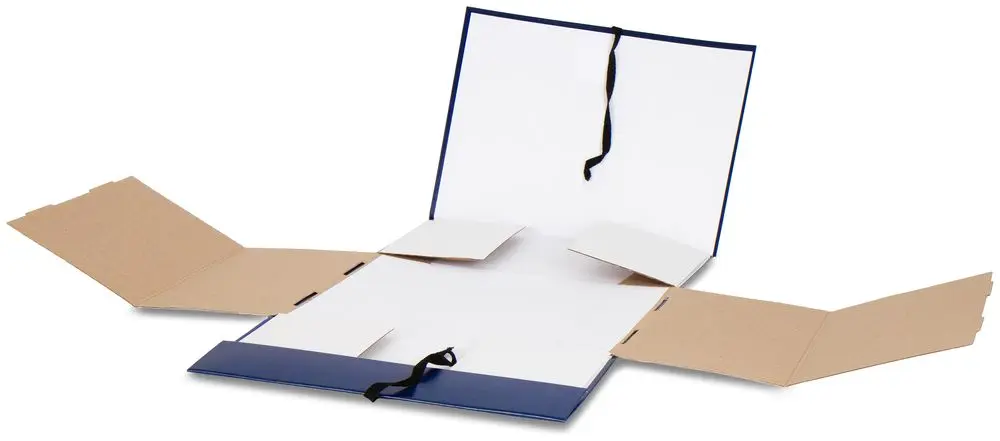 покрыт бумвинилом синего цвета. Внутри короб обклеен офсетной бумагой, также имеются стойки-упоры, выполненные из гофрокартона. В закрытом виде фиксируется