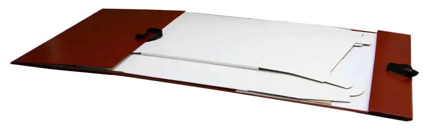 покрыт бумвинилом бордового цвета. Внутри короб обклеен офсетной бумагой, также имеются стойки-упоры, выполненные из гофрокартона. В закрытом виде фиксируется