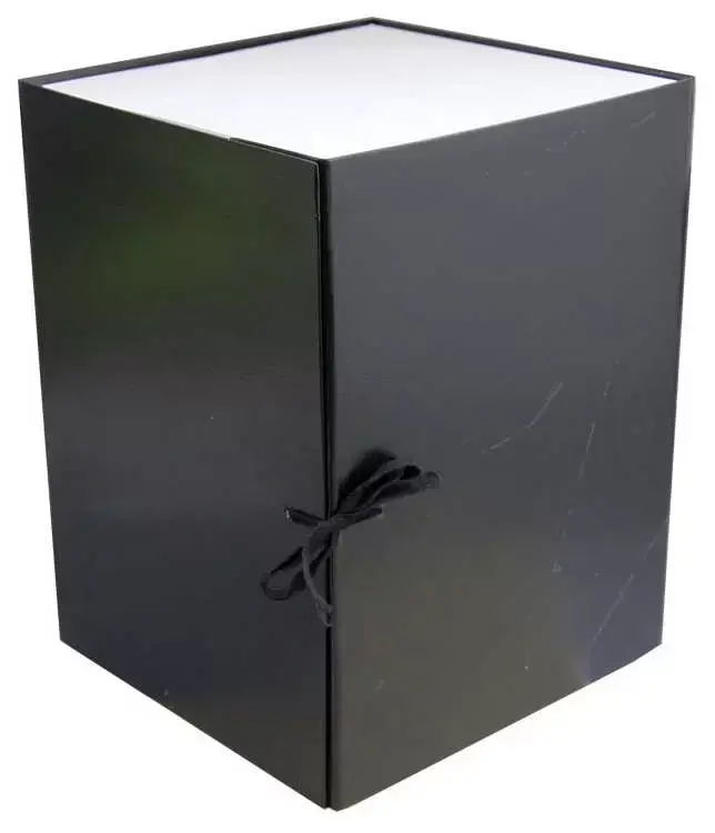 покрыт бумвинилом черного цвета. Внутри короб обклеен офсетной бумагой, также имеются стойки-упоры, выполненные из гофрокартона. В закрытом виде фиксируется