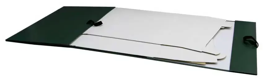 покрыт бумвинилом зеленого цвета. Внутри короб обклеен офсетной бумагой, также имеются стойки-упоры, выполненные из гофрокартона. В закрытом виде фиксируется