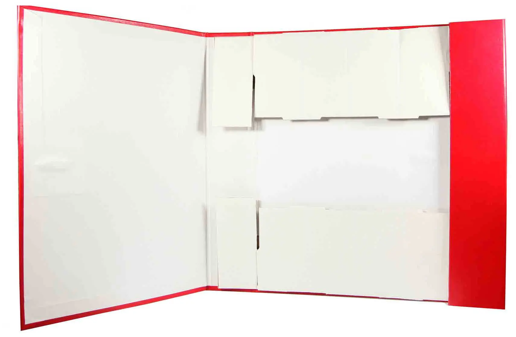 покрыт бумвинилом красного цвета. Внутри короб обклеен офсетной бумагой, также имеются стойки-упоры, выполненные из гофрокартона. В закрытом виде фиксируется