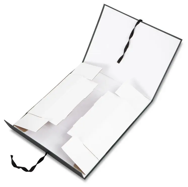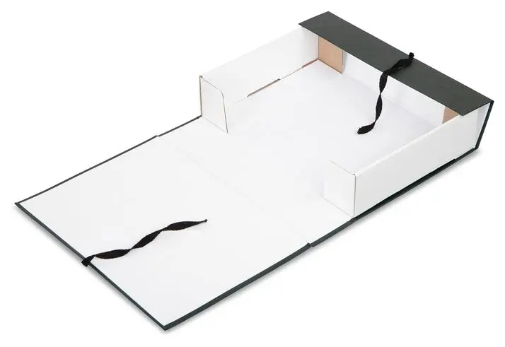 покрыт бумвинилом темно-зеленого цвета. Внутри короб обклеен офсетной бумагой, также имеются стойки-упоры, выполненные из гофрокартона. В закрытом виде фиксируется