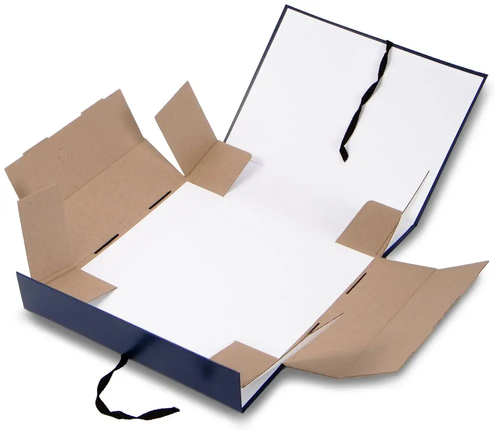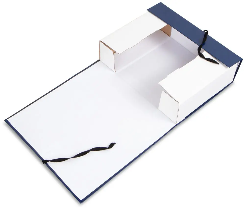 покрыт бумвинилом синего цвета. Внутри короб обклеен офсетной бумагой, также имеются стойки-упоры, выполненные из гофрокартона. В закрытом виде фиксируется