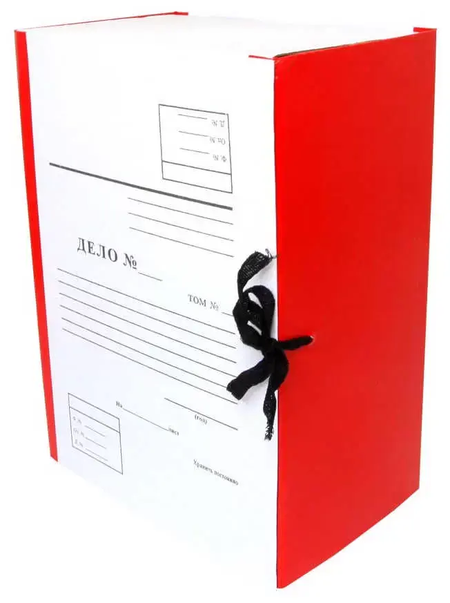 Архивный короб формата А4. Изготовлен из плотного переплетного картона, с внешней стороны покрыт бумвинилом красного цвета. Внутри короб обклеен офсетной бумагой, также имеются стойки-упоры, выполненные из гофрокартона. В закрытом виде фиксируется с помощью двух хлопчатобумажных завязок.