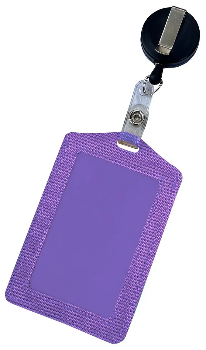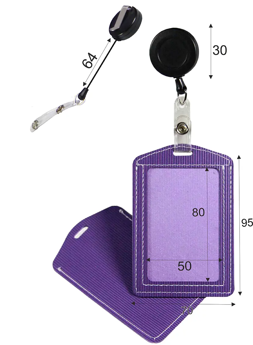 Бейдж вертикальный,70x110 мм, материал PU с прозр ПВХ, прошитый по краю,с ушком для крепления, в комплекте с держателем с метал.ретрактором,фиолетовый