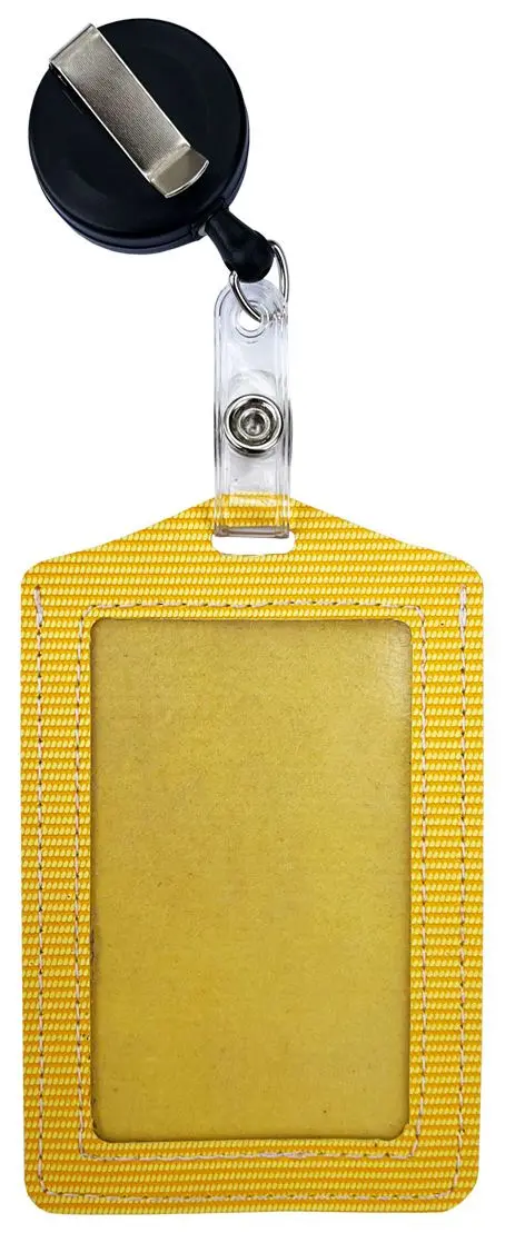 Бейджи из галантерейной пленки PU, прошитые по краям, с окошечком из толстой прозрачной пленки ПВХ. Сделаны под размер визитной карточки или размер банковской карточки. Бейджи имеют ушко для крепления ретрактора или другого держателя. Поставляются в комплекте с качественными ретракторами. Ретракторы в комплекте улучшенного качества, проверены на долгосрочную эксплуатацию, внутреннее крепление втягивающей пружины усиленное и не ломается. Благодаря ретрактору нет необходимости откреплять бейдж, достаточно потянуть шнурок ретрактора, который потом втягивается автоматически. Цвет желтый