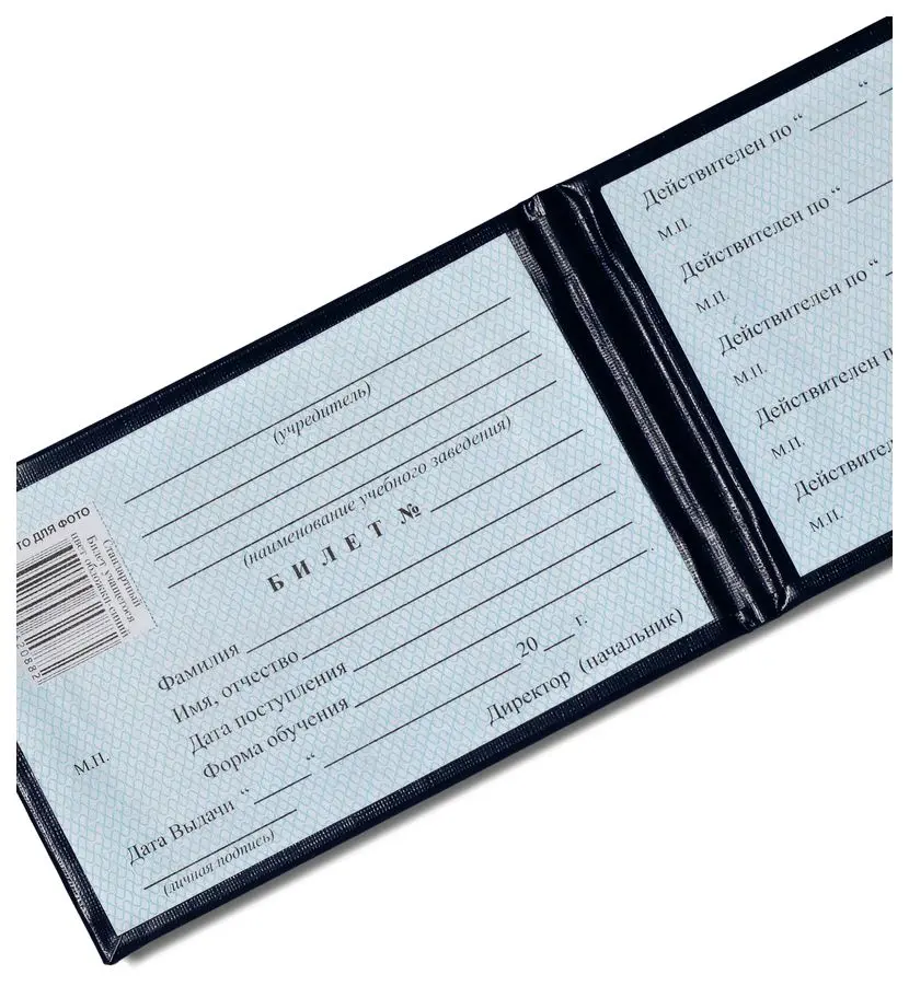 Билет учащегося в жесткой обложке 95*65 мм. Переплет изготовлен из синего бумвинила, надпись "БИЛЕТ УЧАЩЕГОСЯ" выполнена золотым тиснением. Внутри удостоверение имеет бумажную вклейку для заполнения.