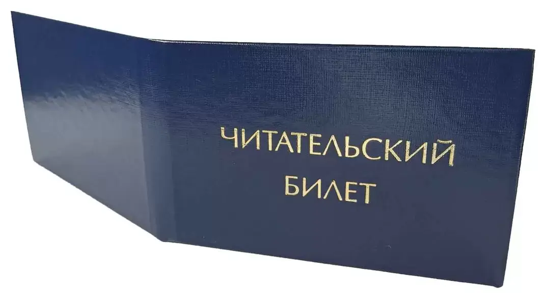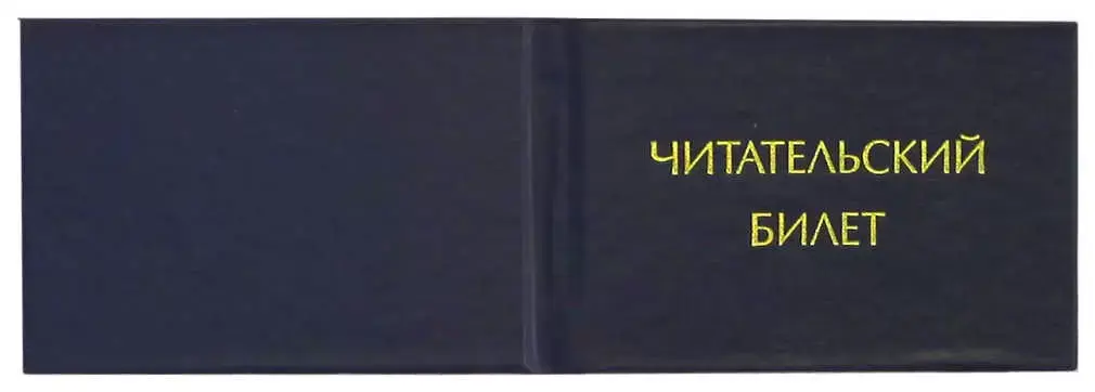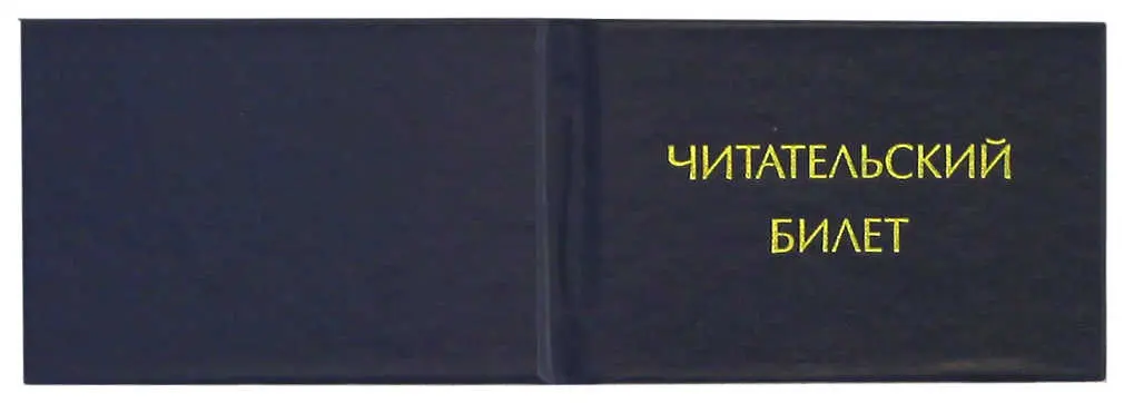 Читательский билет в жесткой обложке 95*65 мм. Переплет изготовлен из синего бумвинила, надпись "ЧИТАТЕЛЬСКИЙ БИЛЕТ" выполнена золотым тиснением. Внутри удостоверение имеет бумажную вклейку для заполнения.